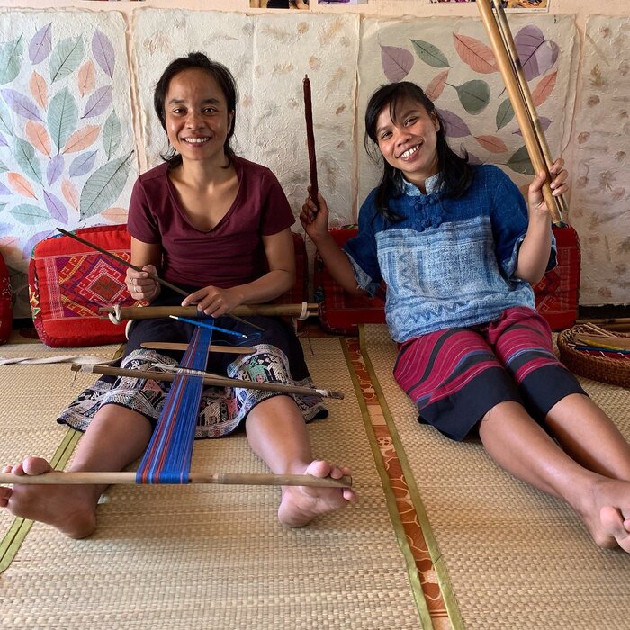 We are two of Katu sisters from the Salavan province in Southern Laos. Our fabrics are very special because we use an ancient style of decoration which includes incorporating glass beads into the warp of the weave. You will never see cloth like this anywhere else and some of these designs can only be bought from our family. There is also the soft and naturally dyed cloth that is used for everyday clothing.